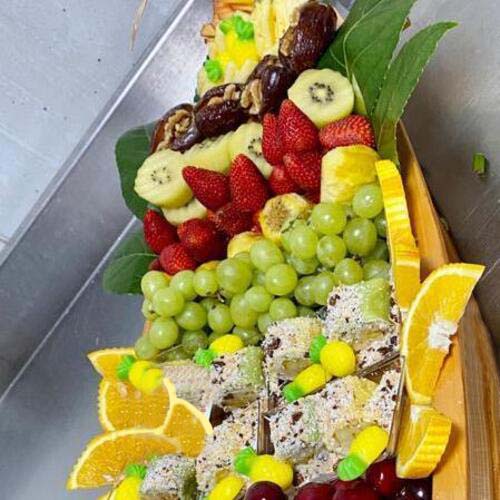 ספינת פירות מלאה המכילה בין 10-15 סוגי פירות העונה, פירות טרופיים, תוספות של פירות יבשים וסושי פירות. כל הפירות טריים, נחתכים ומעוצבים לפני שליחת המשלוח.הספינה עשויה מעץ. פירות הנכללים: אבטיח, מלון, קיווי, ענבים ירוקים/שחורים, מנגו, נאשי (תפוח בטעם אגס), רימון, תפוז, תאנים, קלמנטינה, סברס, פומלה, תמר לח, קוקוס, קרמבולה, פפאיה, אפרסמון, תות שדה, שסק, אפרסק, נקטרינה, משמש, דובדבנים אדומים/לבנים, פסיפלורה ועוד. ספינה באורך 90 ס״מ  מתאים ל כ 30 איש